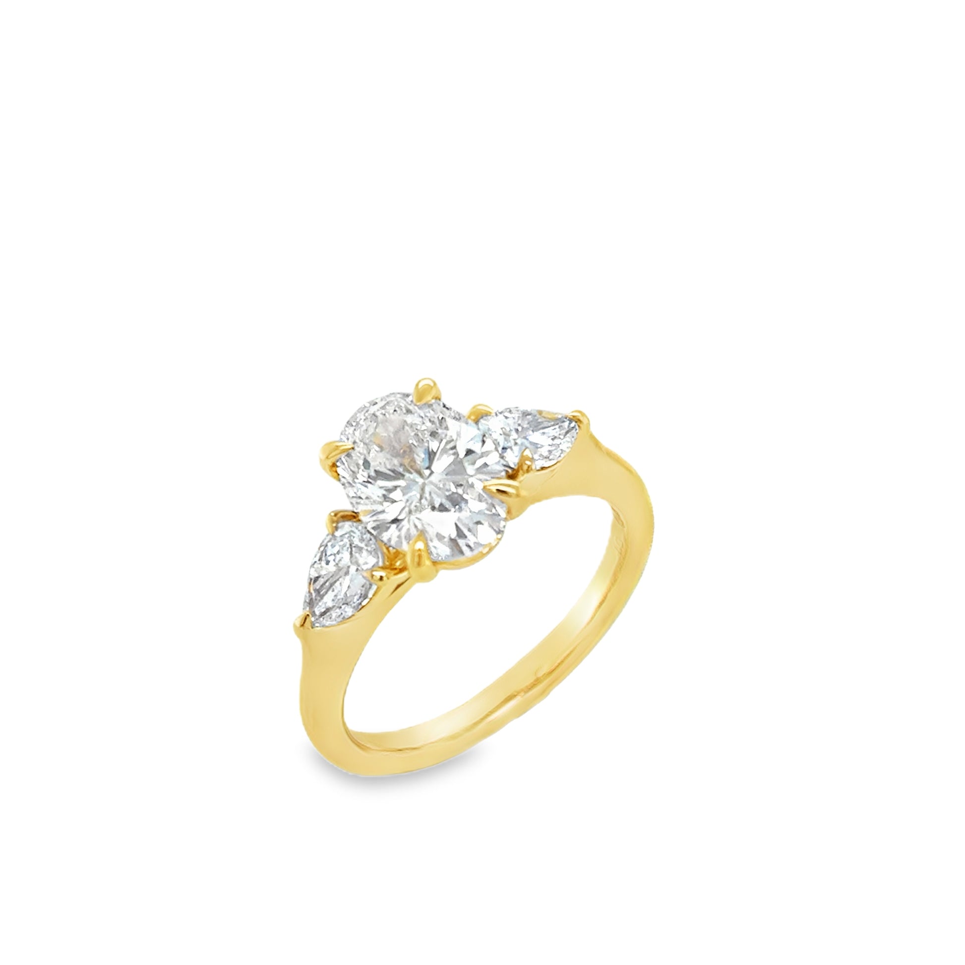 18ct 3 Stone Cultured Diamond Ring Oval Modified Brilliant Cut Centre With Pear Shoulders 2.83ct