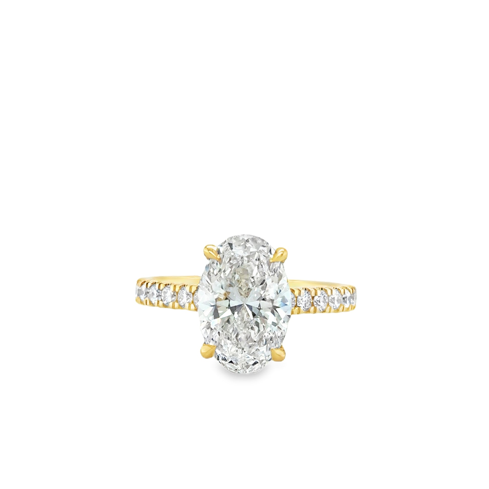 18ct Oval Modified Brlliant Cut Cultured Diamond Ring With Hidden Halo & Stone Set Shoulders 3.58ct