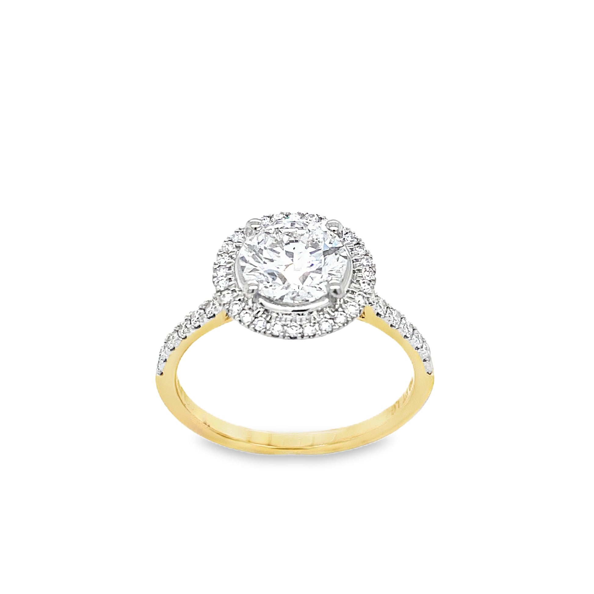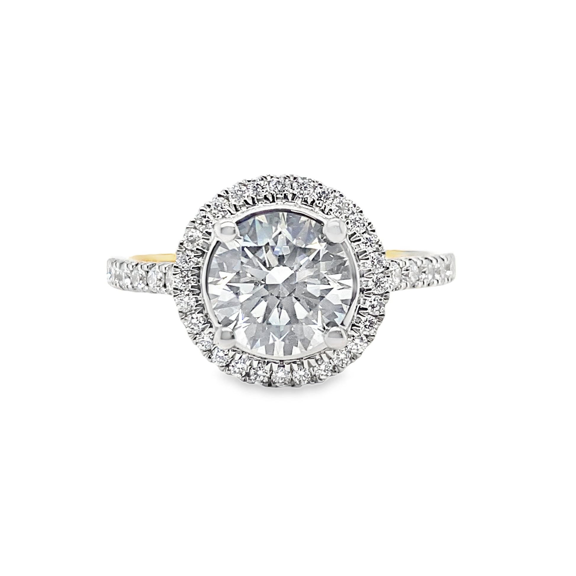 18ct Round Solitaire Cultured Diamond Ring with Cultured Diamond Set Halo and Shoulders 1.85ct