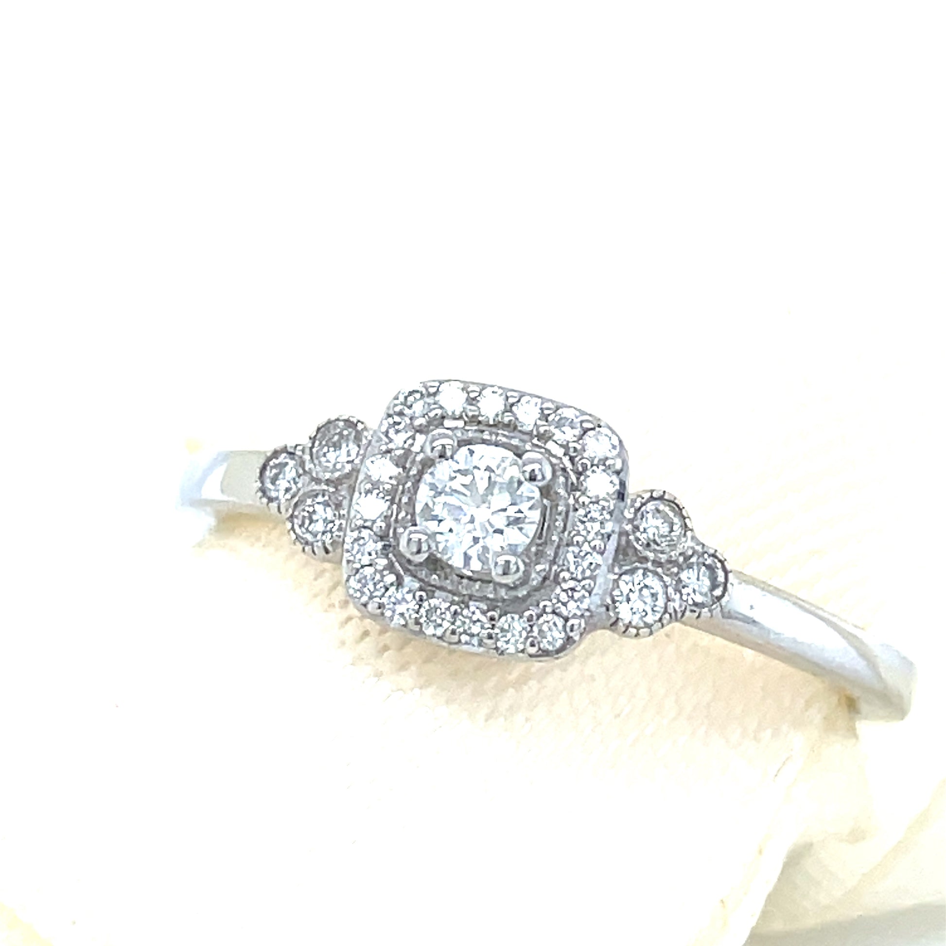 9ct White Gold Round Brilliant Square Halo Set Diamond Ring With Antique Style Shoulders 0.20ct
