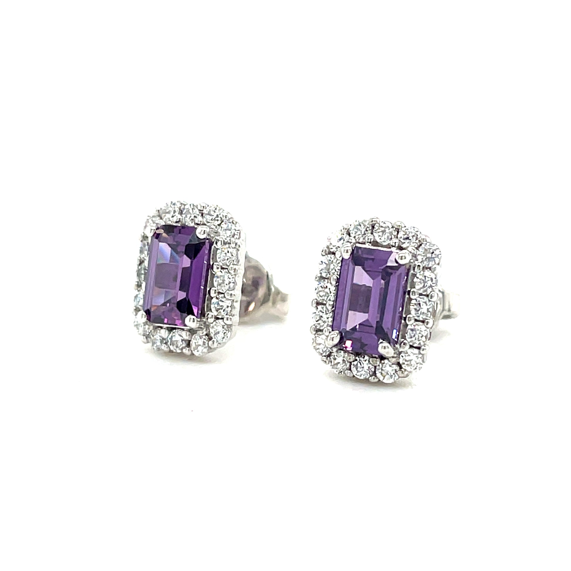 9CT White Gold Emerald Cut Halo Cubic Zirconia and Purple Stone Stud Earring
