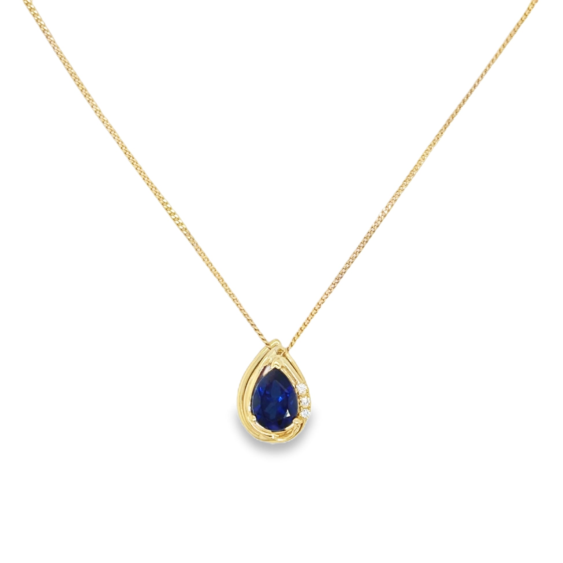 9ct Yellow Gold Pear Cut Sapphire Swirl Pendant with Cultured Diamond Detail .02ct