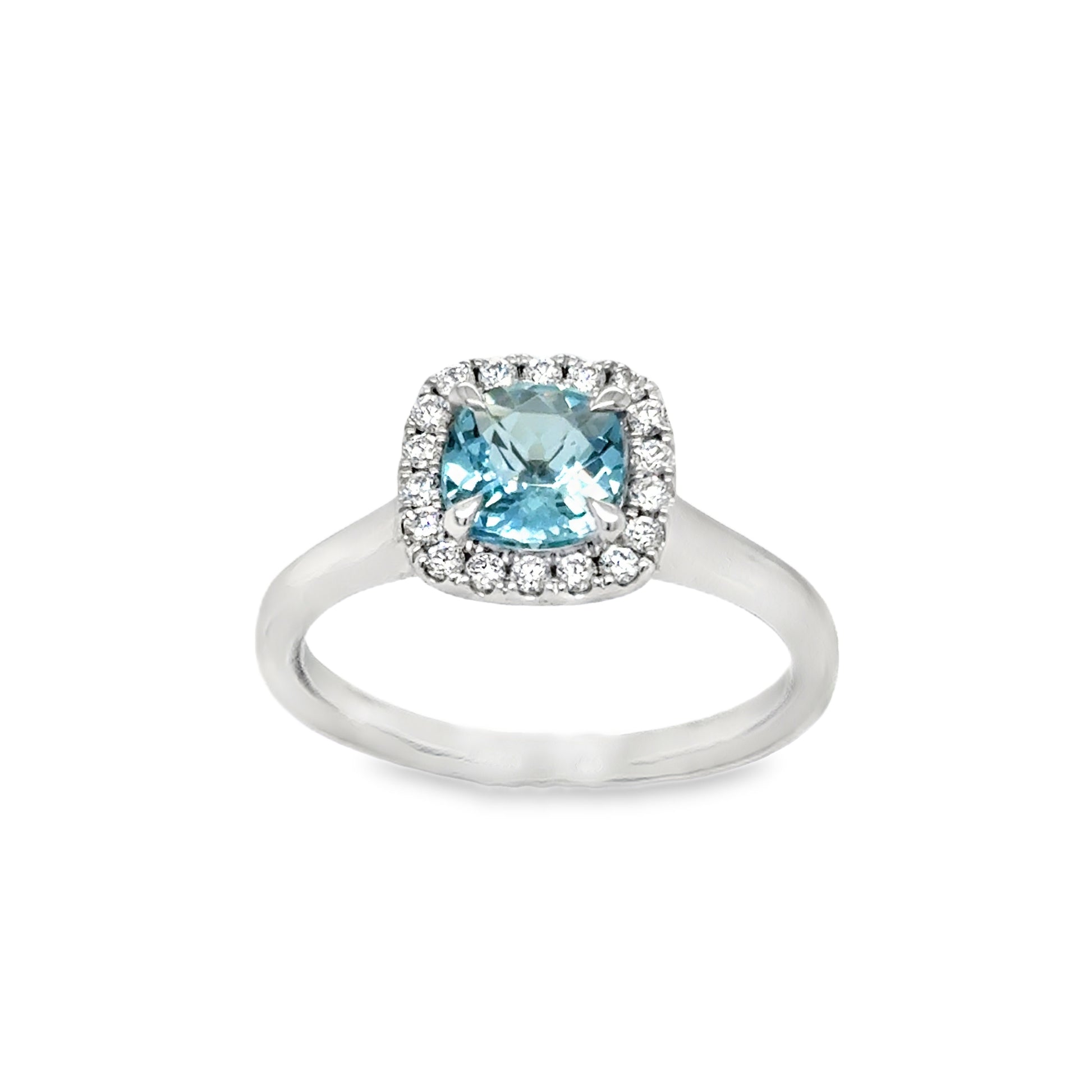 Platinum Aquamarine Cushion Cut Ring With Diamond Halo .20ct