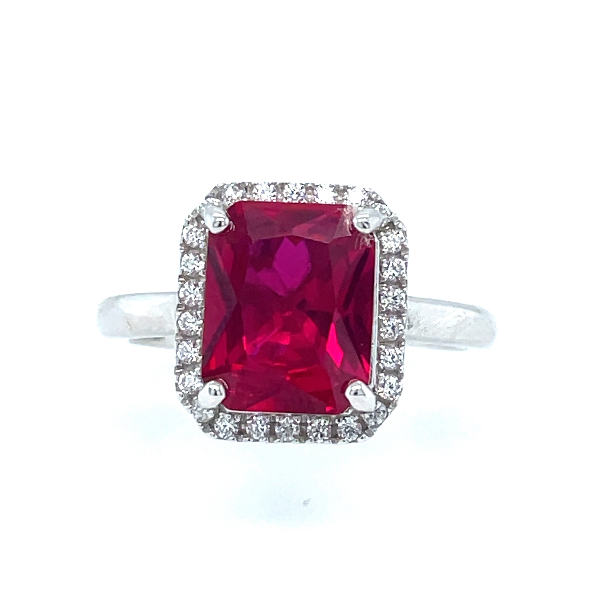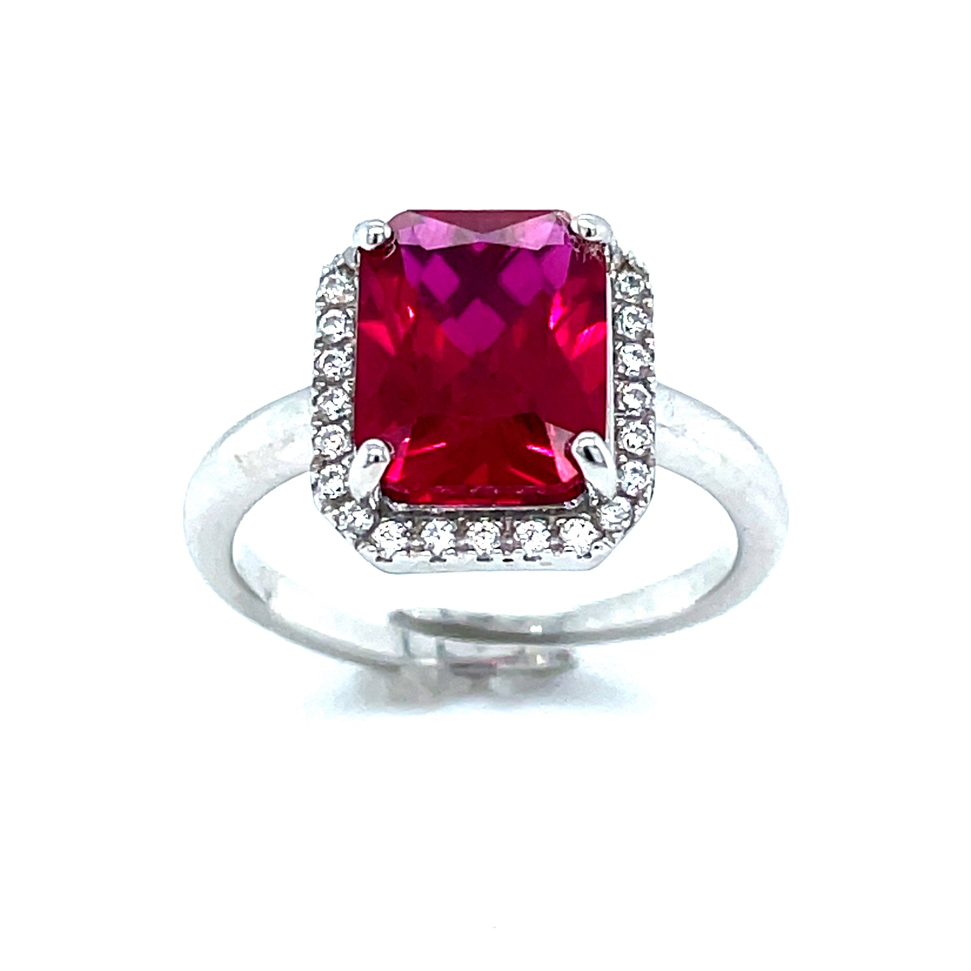 STERLING SILVER CUBIC ZIRCONIA AND RED STONE EMERALD CUT HALO EXPANDER RING