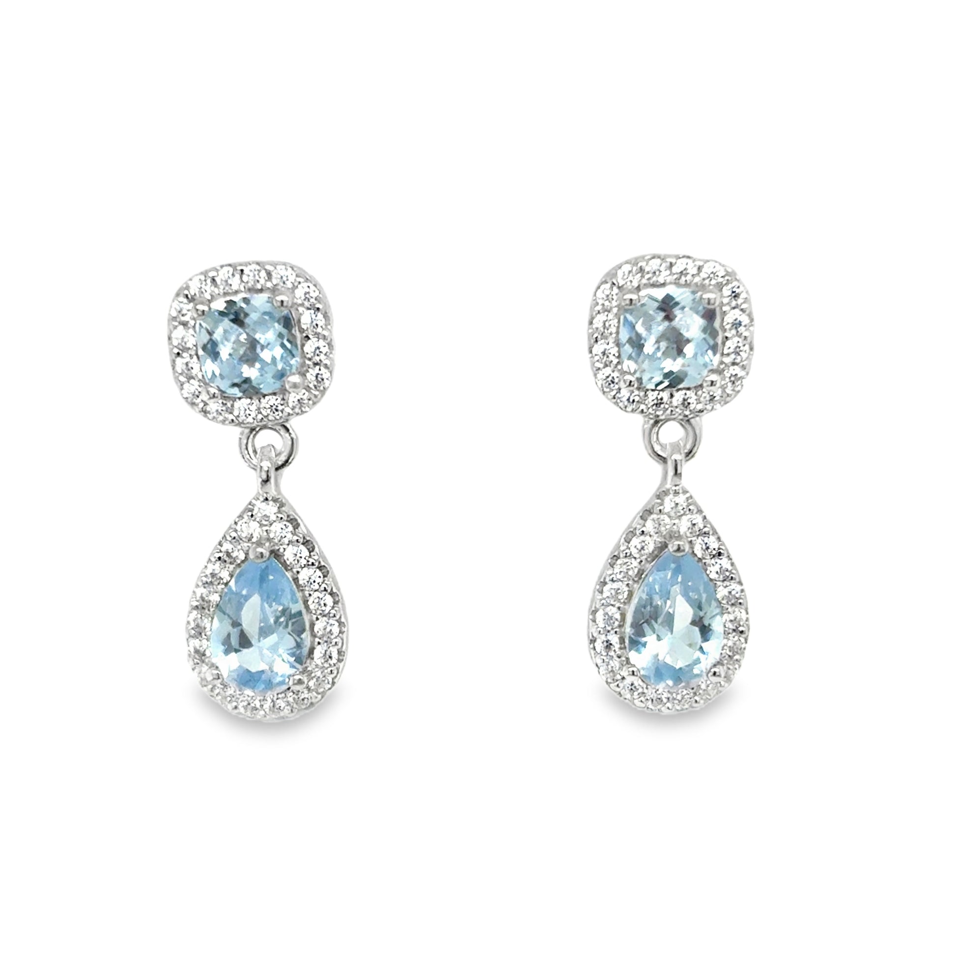 Sterling Silver Cushion and Pear Cut Blue CZ Cluster Drop Earrings