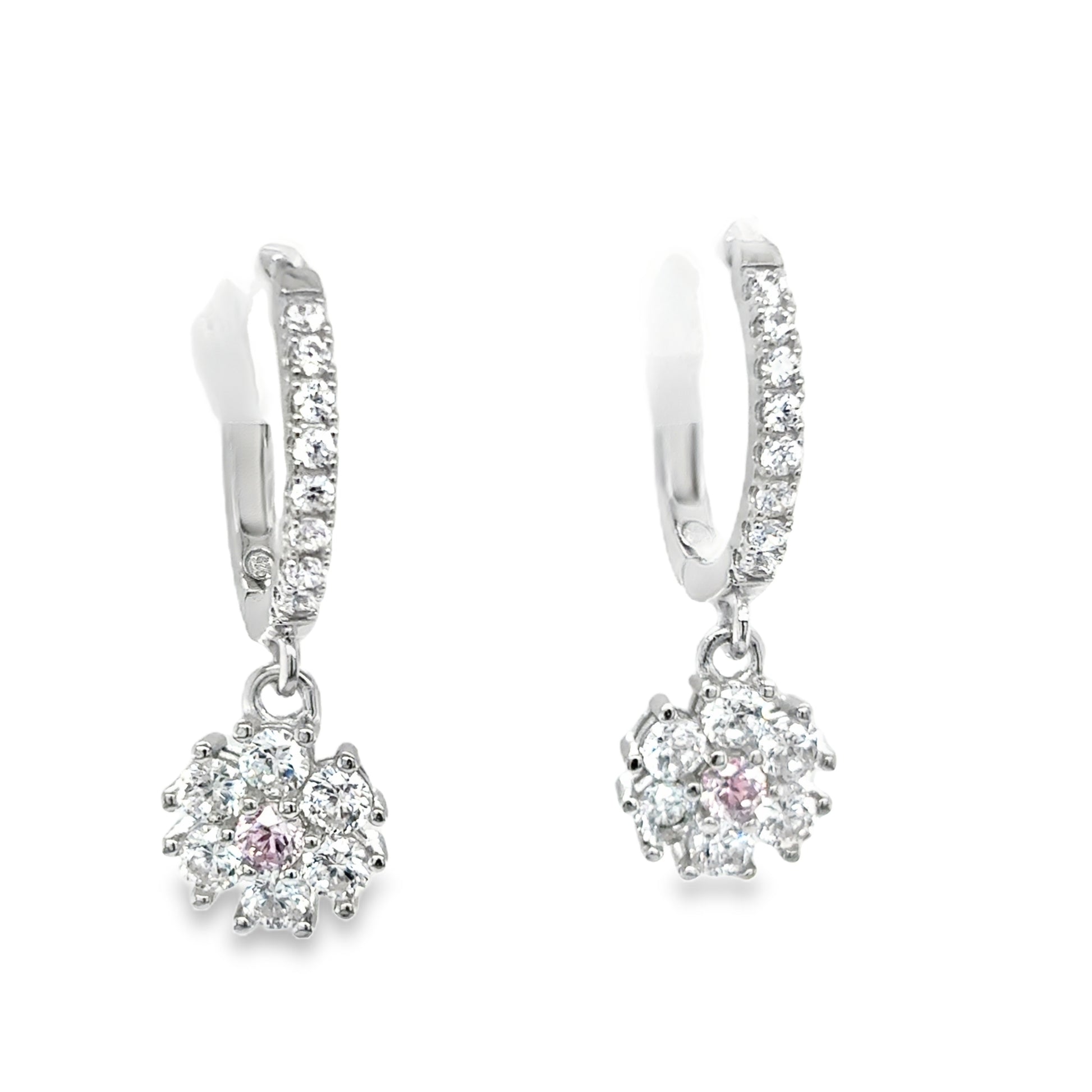 Sterling Silver CZ and Pink Flower Cluster Huggy Drop Earrings