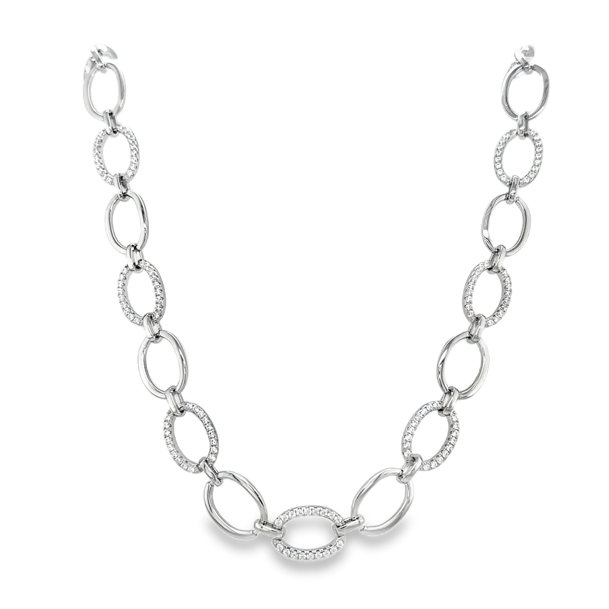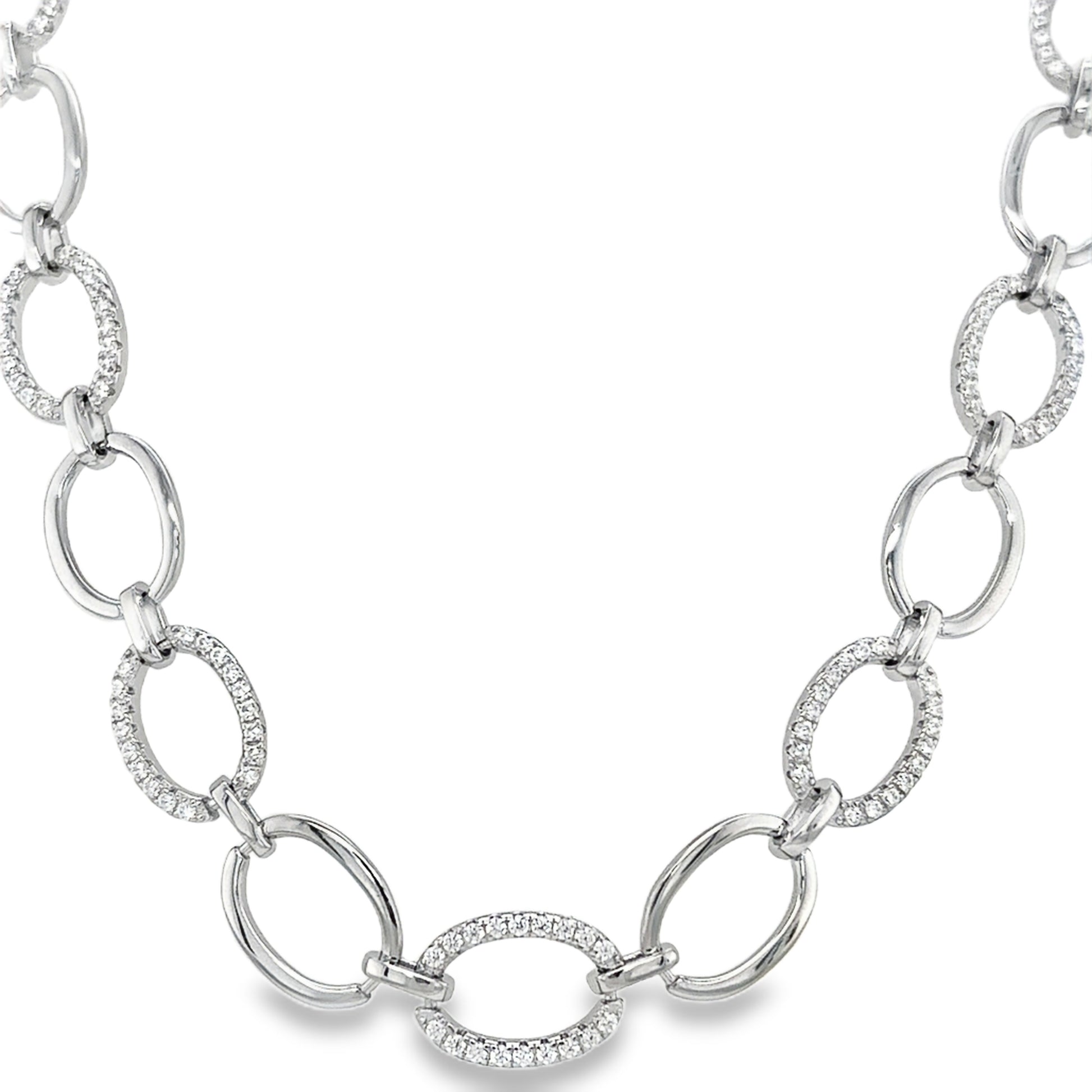 Sterling Silver CZ and Polished Graduated Open Oval Link Necklet