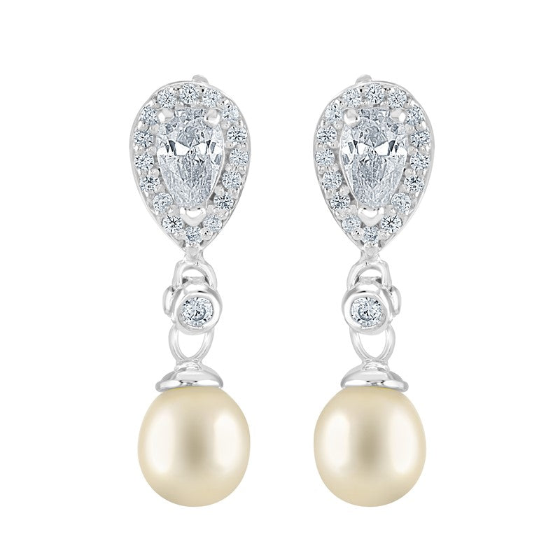 Sterling Silver CZ Pear Halo Earring With Pearl Drop