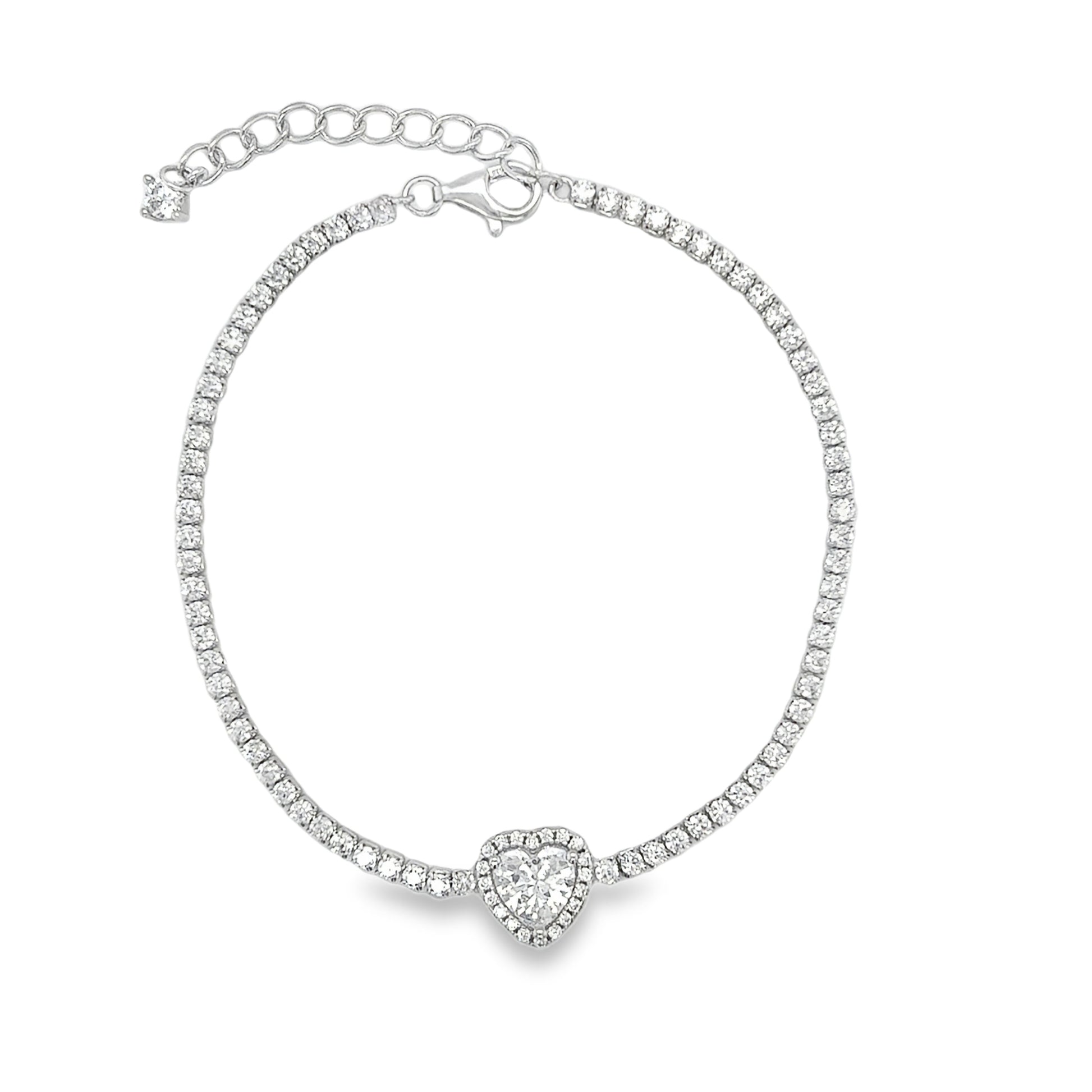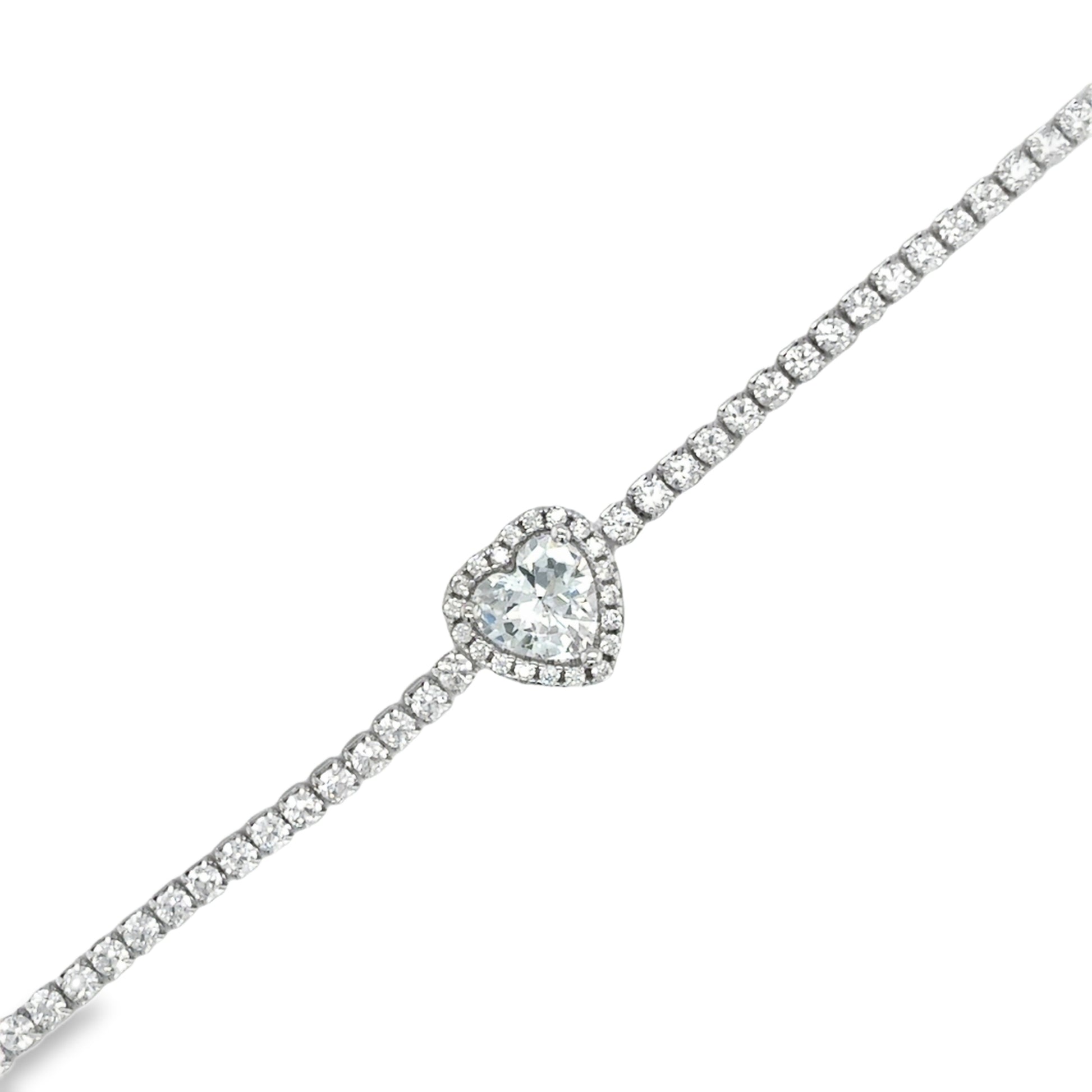 Sterling Silver CZ Tennis Bracelet With Heart Halo Centre