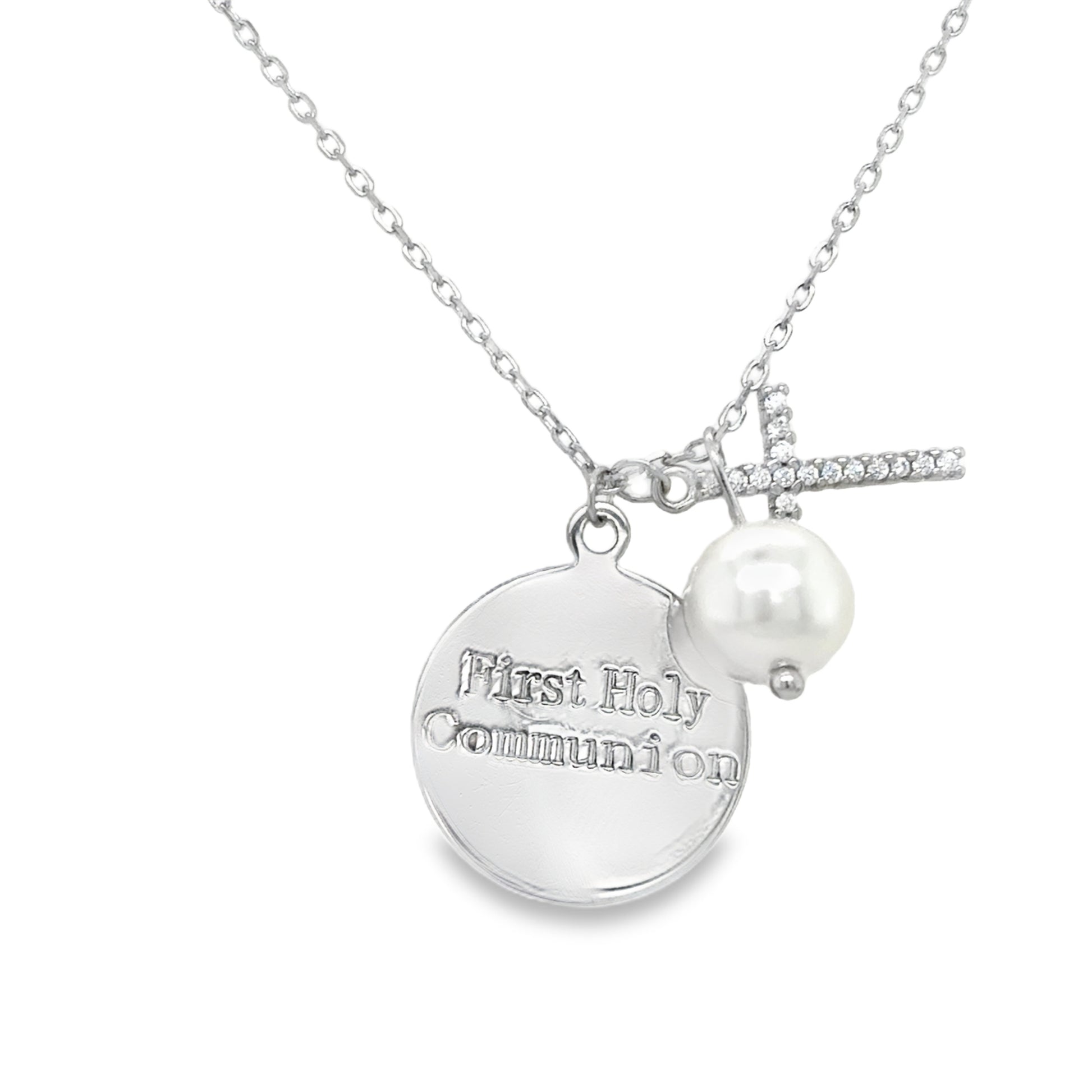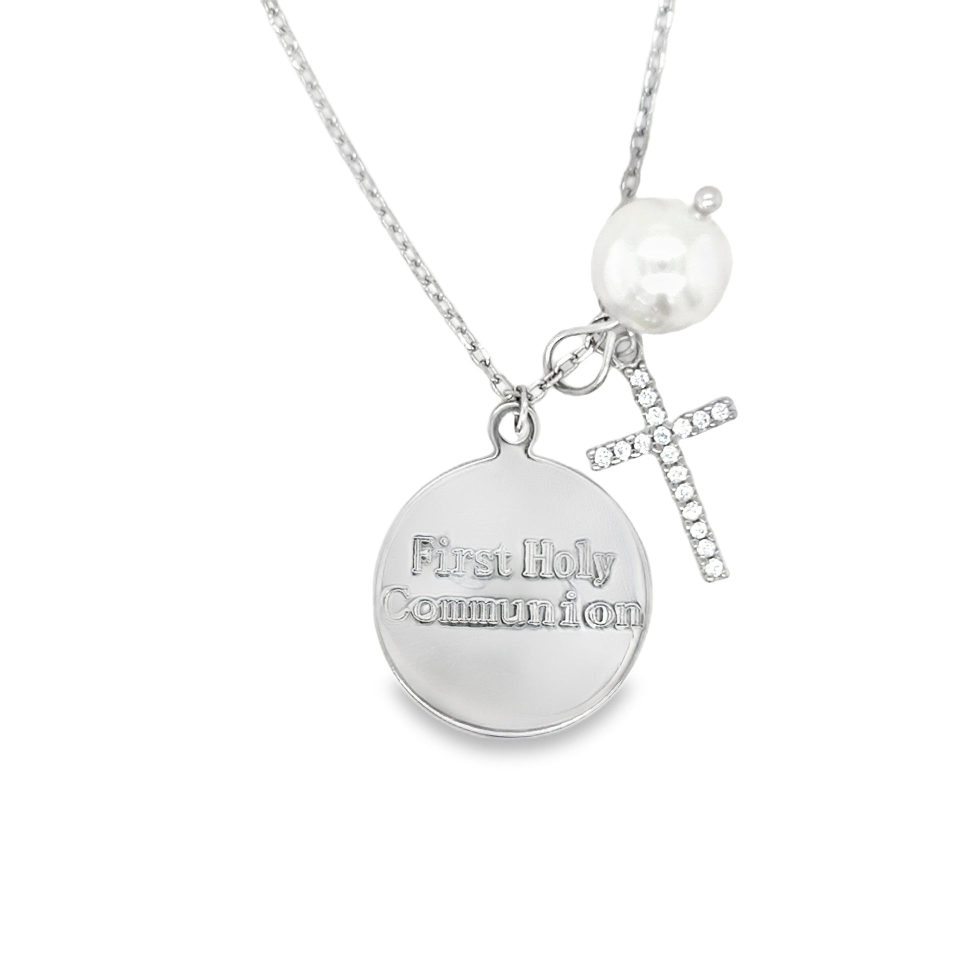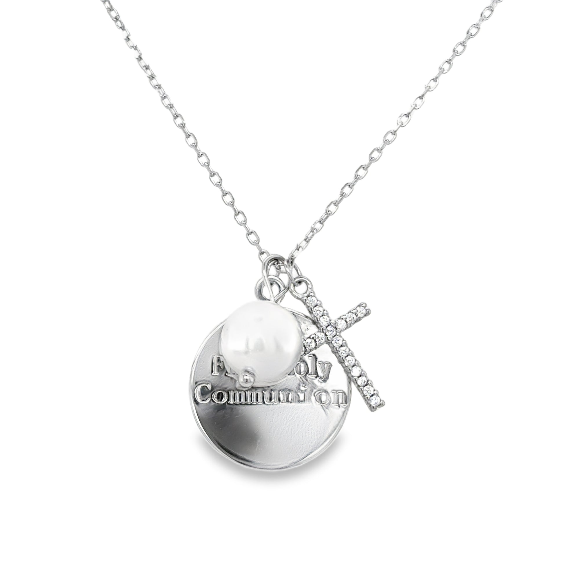 Sterling Silver First Holy Communion Disc with CZ Cross and Pearl Necklet