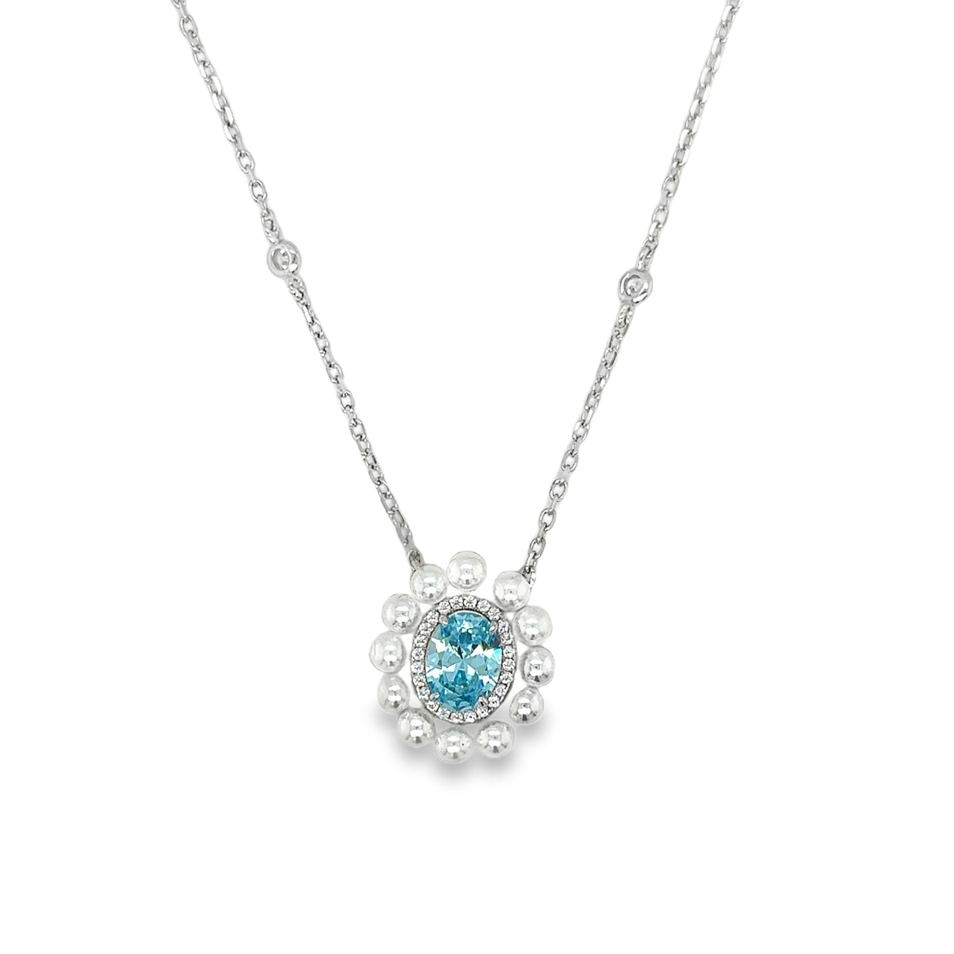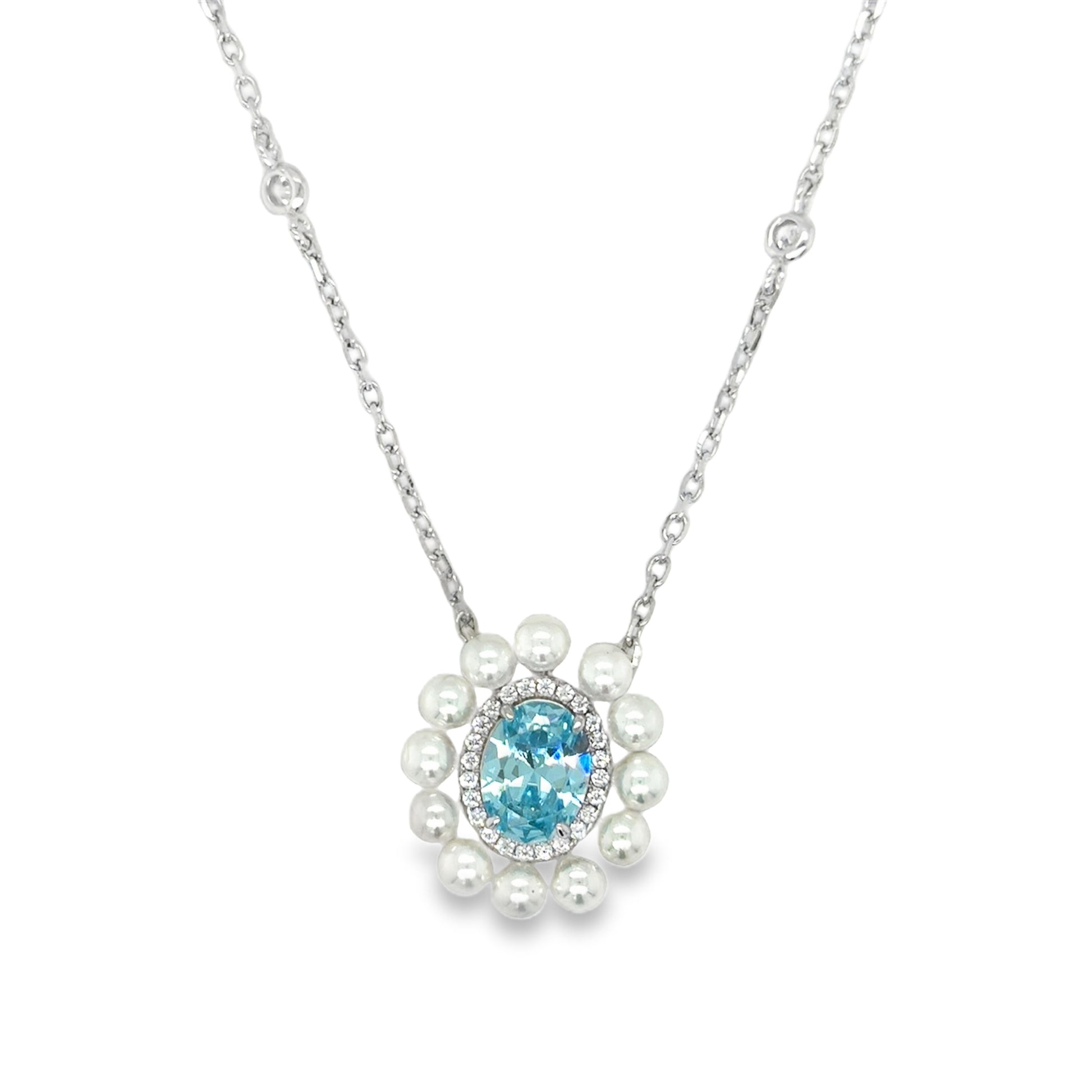 Sterling Silver Oval Blue CZ and Pearl Halo Pendant