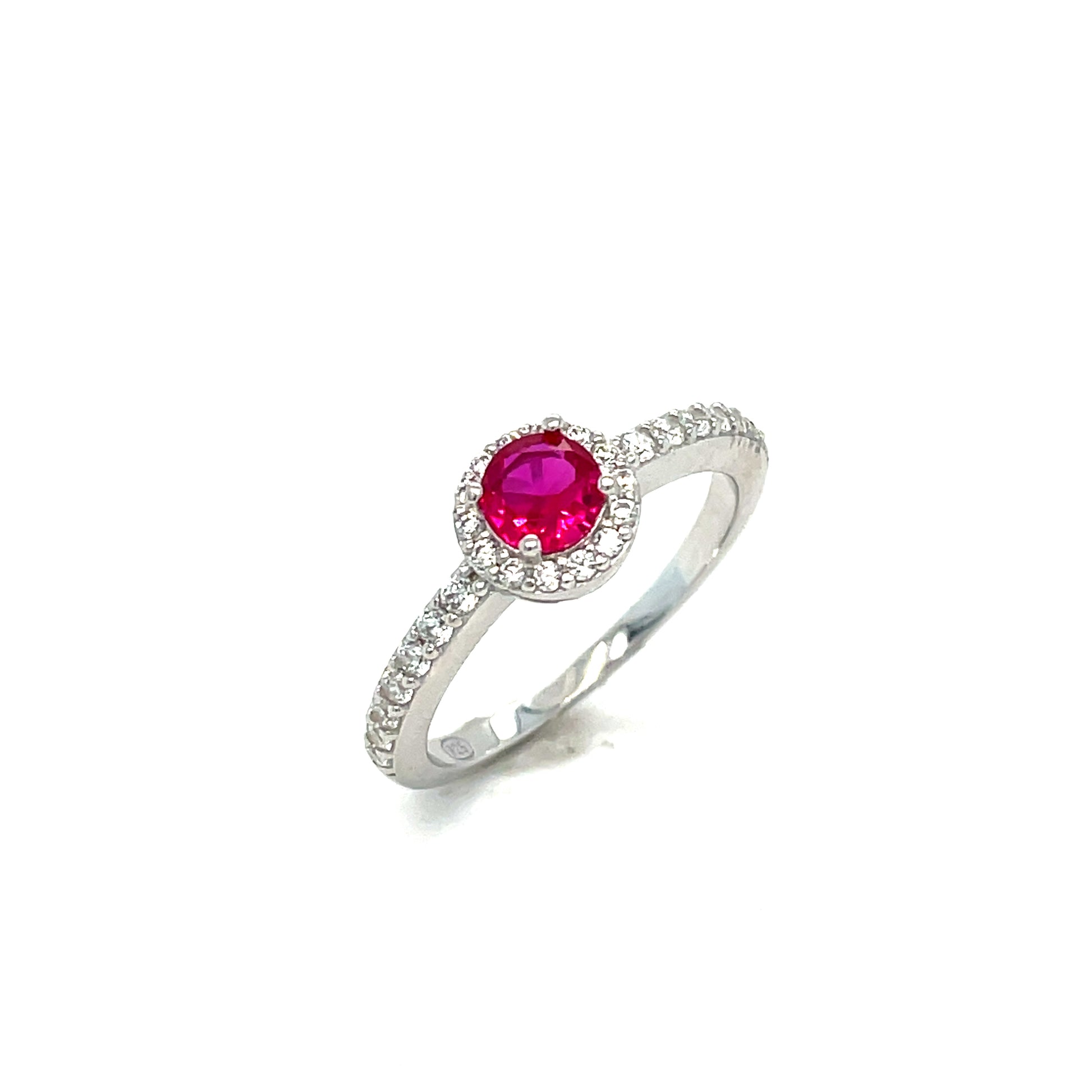 Sterling Silver Round Red CZ Solitaire Rijng with CZ Halo and Shoulders